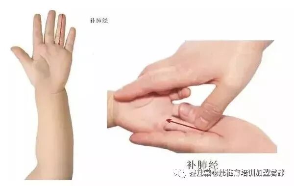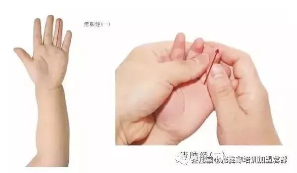 说明:肺经一般用清法或泻法,不用补法。小儿慢性腹泻、虚寒泻,应用本穴时应慎重,推清本穴时间要少,或不取本穴,用之不当,多见腹泻加剧;如患急症需用本穴时,可推清本穴1~2次,待症状缓解后,应停用。自汗、盗汗及脱肛可用补法,对肺风喘急等症,禁用补法。